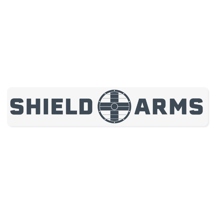 Represent Shield Arms with our 2" x 10", back adhesive banner sticker. While the Shield Arms name was inspired by Psalm 28:7, the logo is our take on a historical Anglo-Saxon war shield. Anglo-Saxon shields were circular, constructed from wood planks which had been glued together, with an iron boss attached at the center.