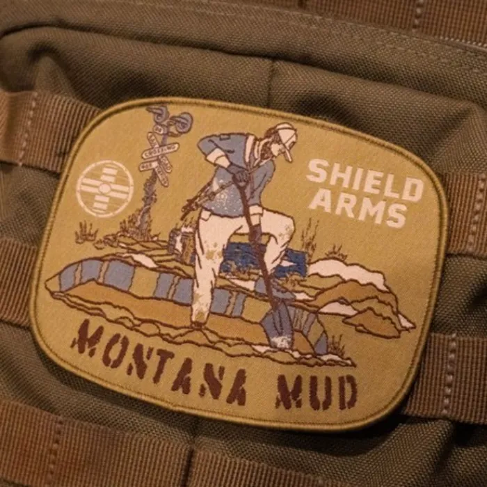 Represent Shield Arms with the custom In-house designed "Montana Mud" Patch! This patch is woven and available in 3" x 2" with a Velcro back to work on any Velcro surface.