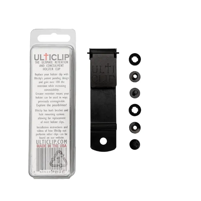 The Ulticlip Classic features a dual mounting bracket and works with single-point attachment holsters. It can also be used with holsters that use a retention slot to lock the clip in place without the need for a screw.