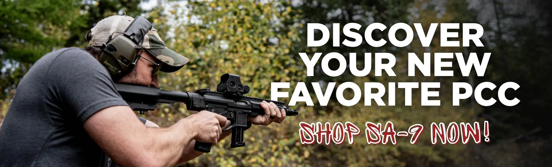 Gen 2 SA-9 folding 9mm pistol built on Shield Arms Folding Lower Receiver. Accepts standard Glock double-stack magazines. 7.5" barrel, folds to 13" for compact storage. Last round bolt hold open, premium components. Ships with Mountain Partisan Sling. Made in USA, lifetime warranty.